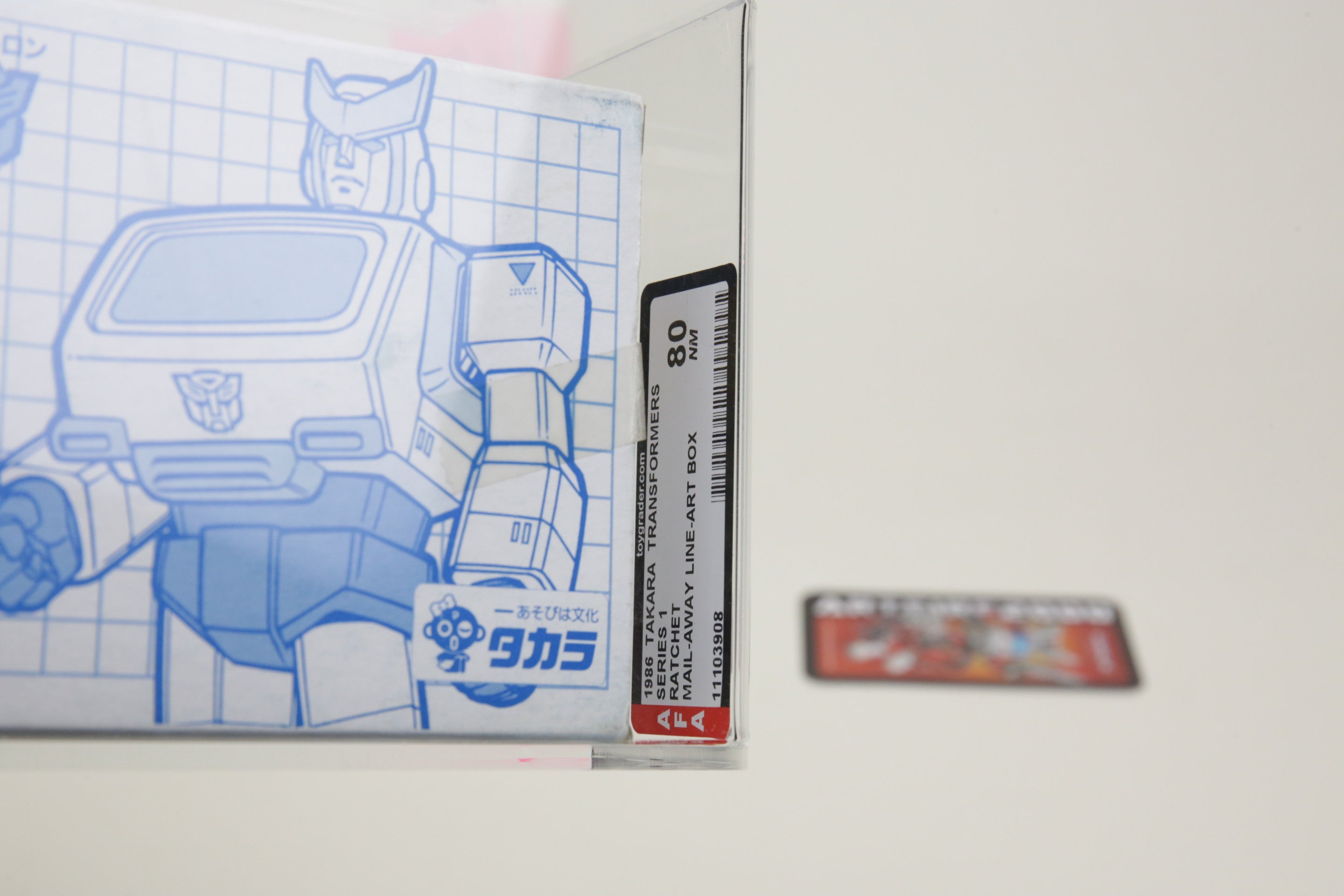In Japan, the only way you could get a Ratchet Transformer was through mailaway. This is the earlier blue-line box. Toy is in tape-sealed condition with a grade of 80 from AFA. Really nice!