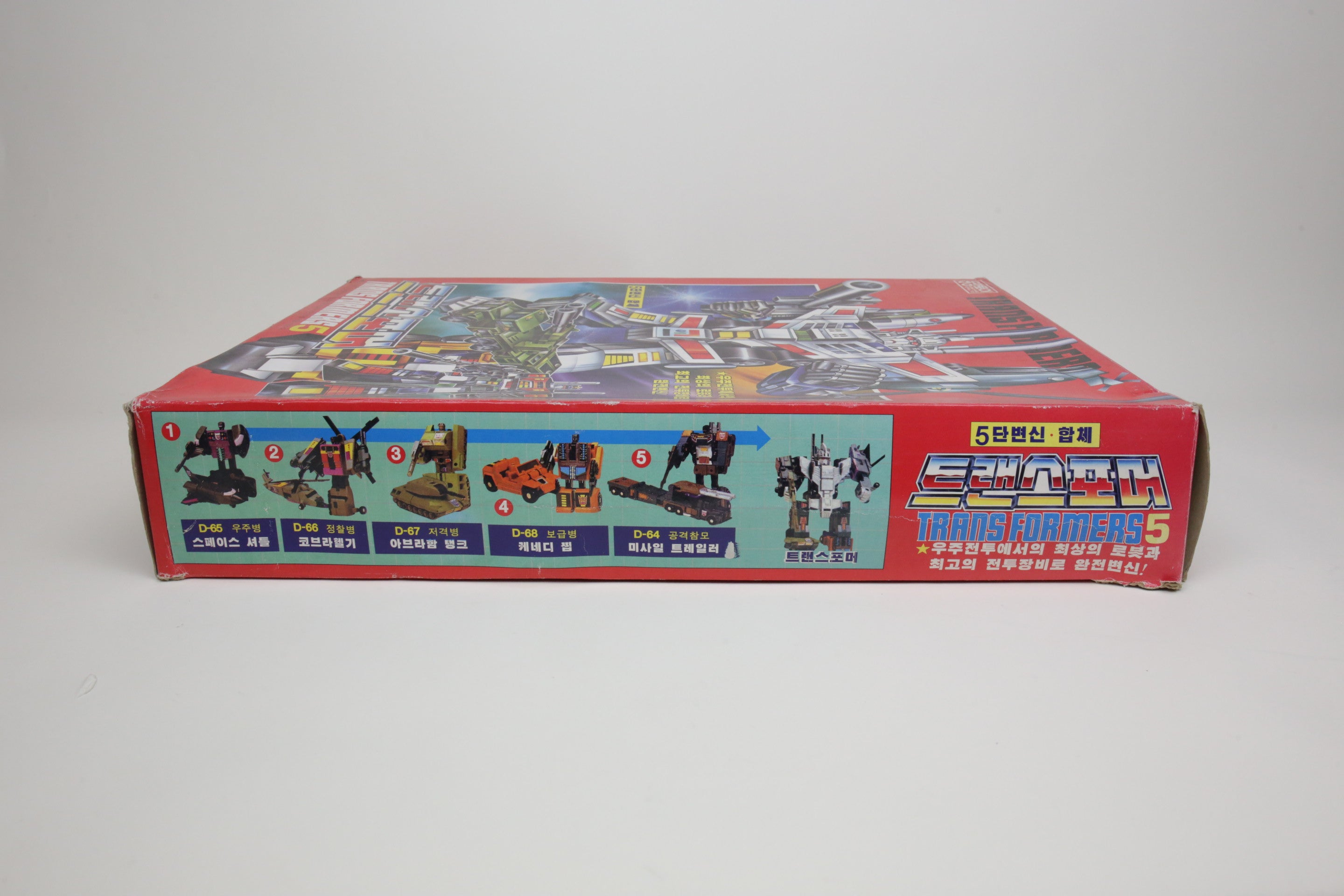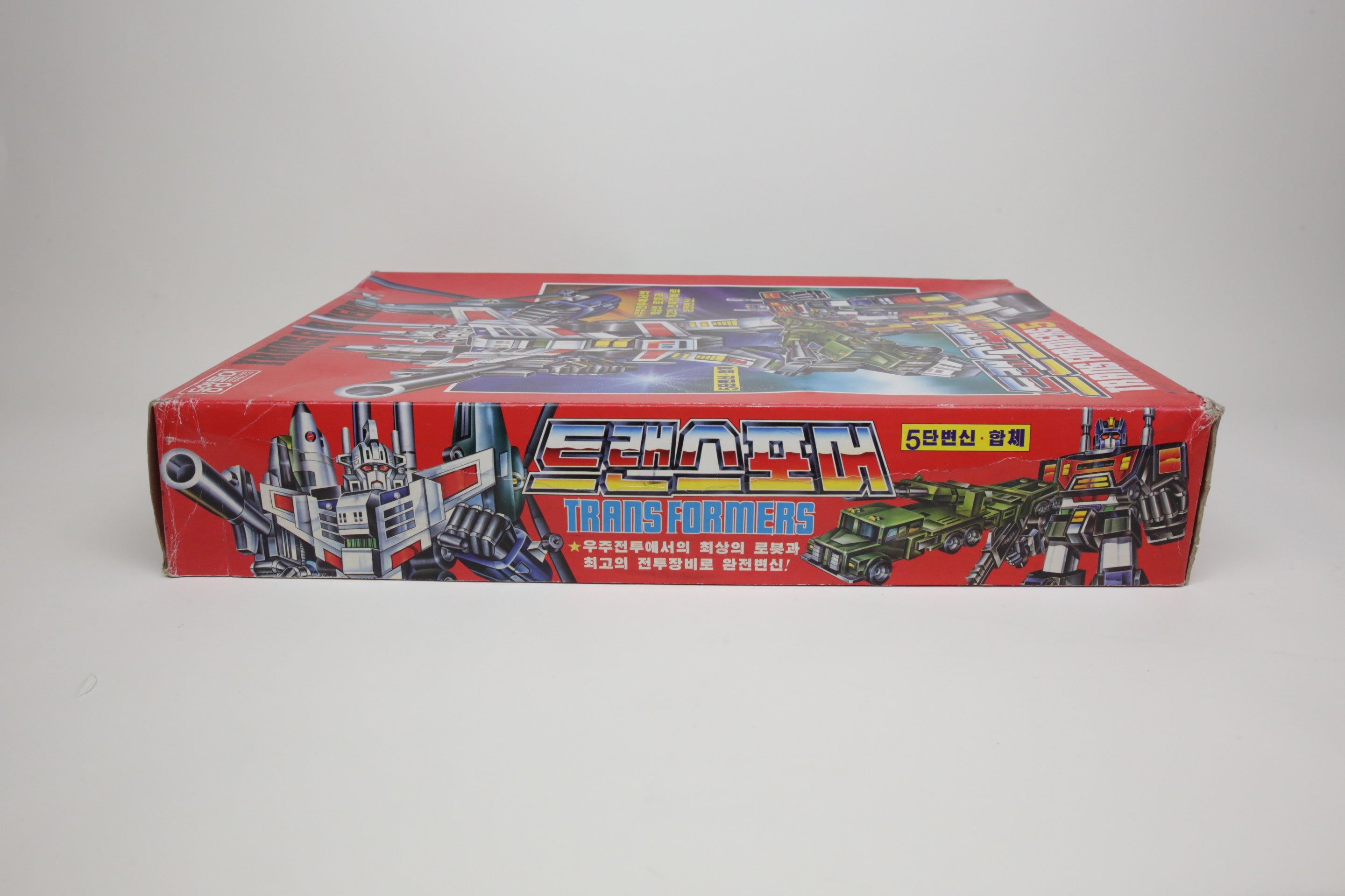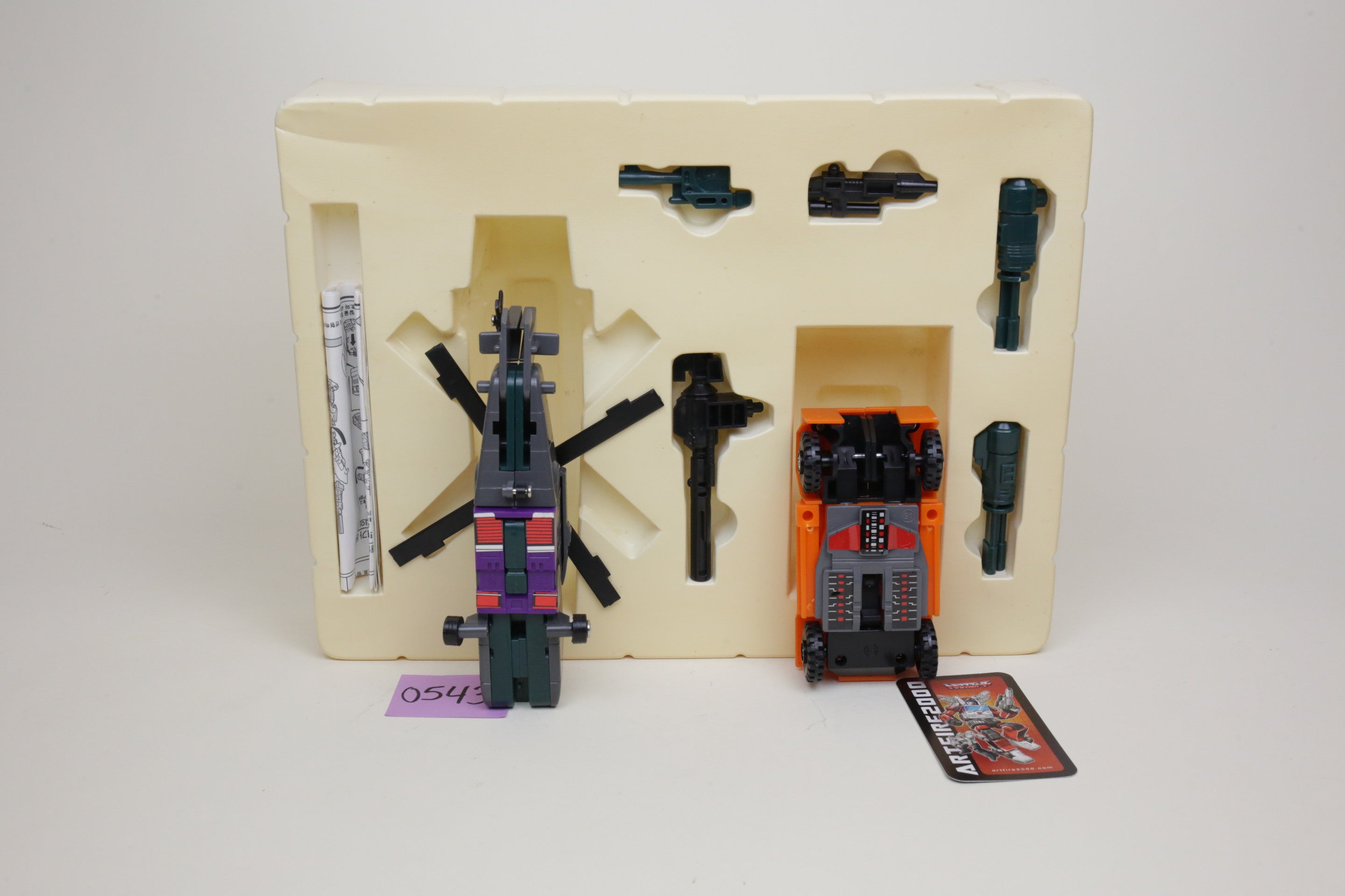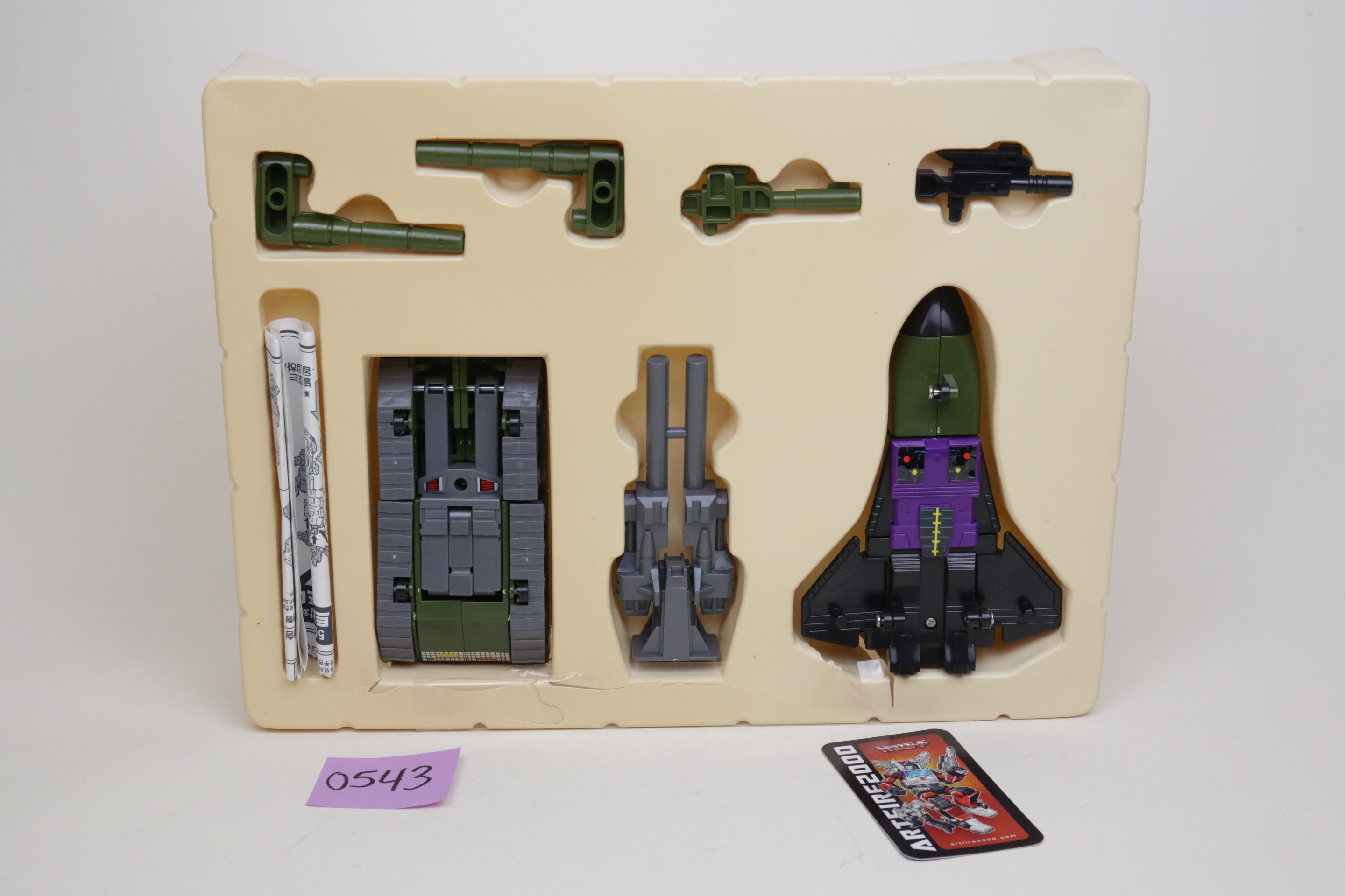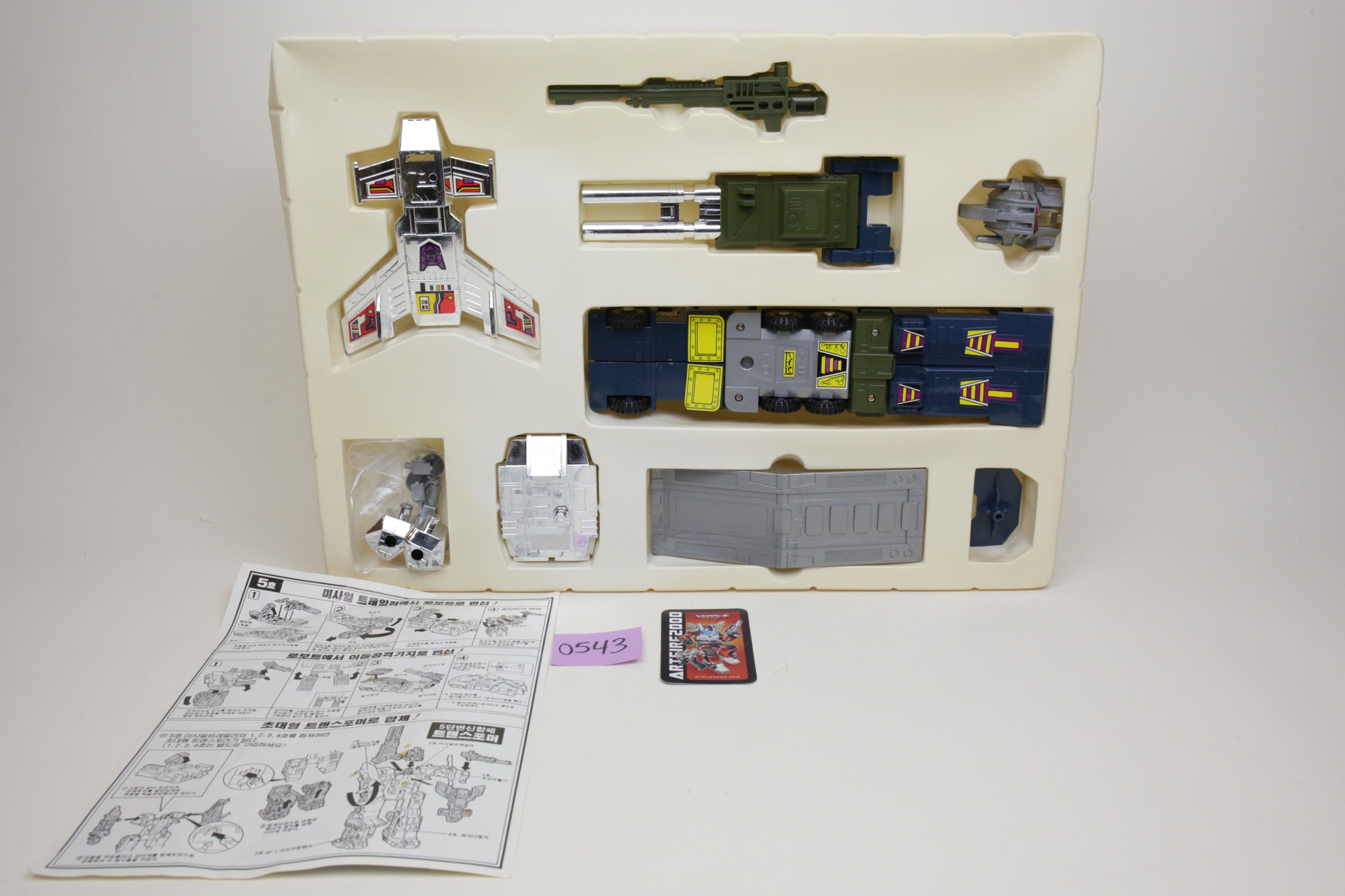 In the spirit of high-quality Korean KOs, this is Bruticus. It’s huge and very difficult to find. Toys are in good shape and are completely unused. The smaller G1 Onslaught is just for comparison, and not included. Some of the plastic inserts have some cracking from age.
