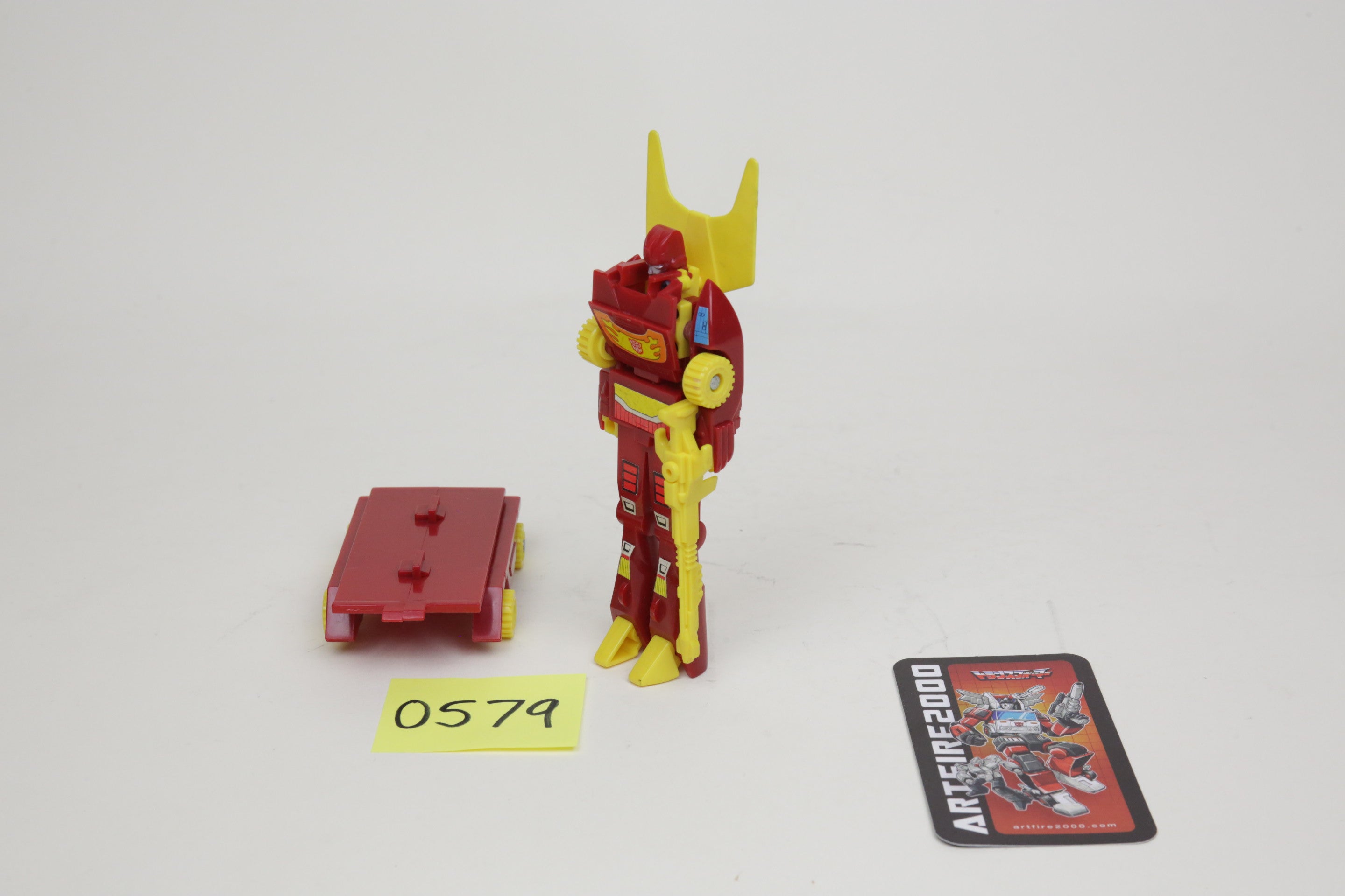 Rodimus Jr is a difficult to find Japanese exclusive. The original version had a carboad trailer top that this no longer has, but this has all of its hard plastic parts.