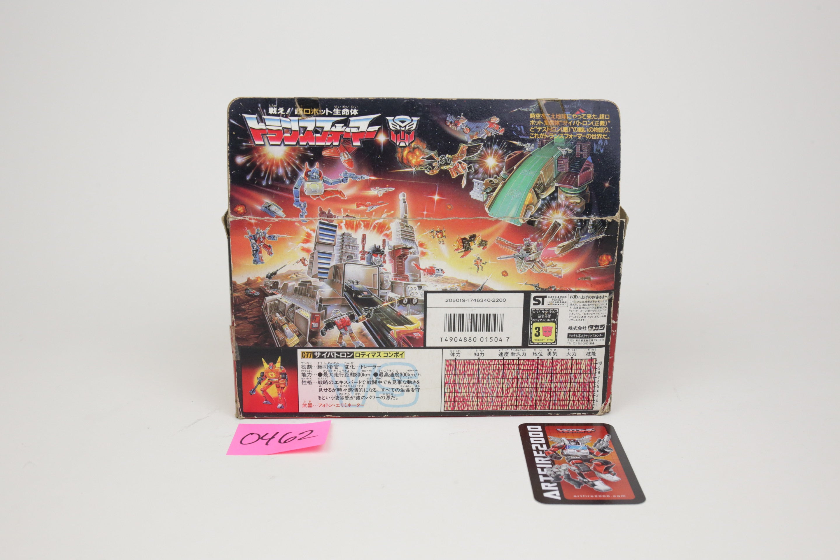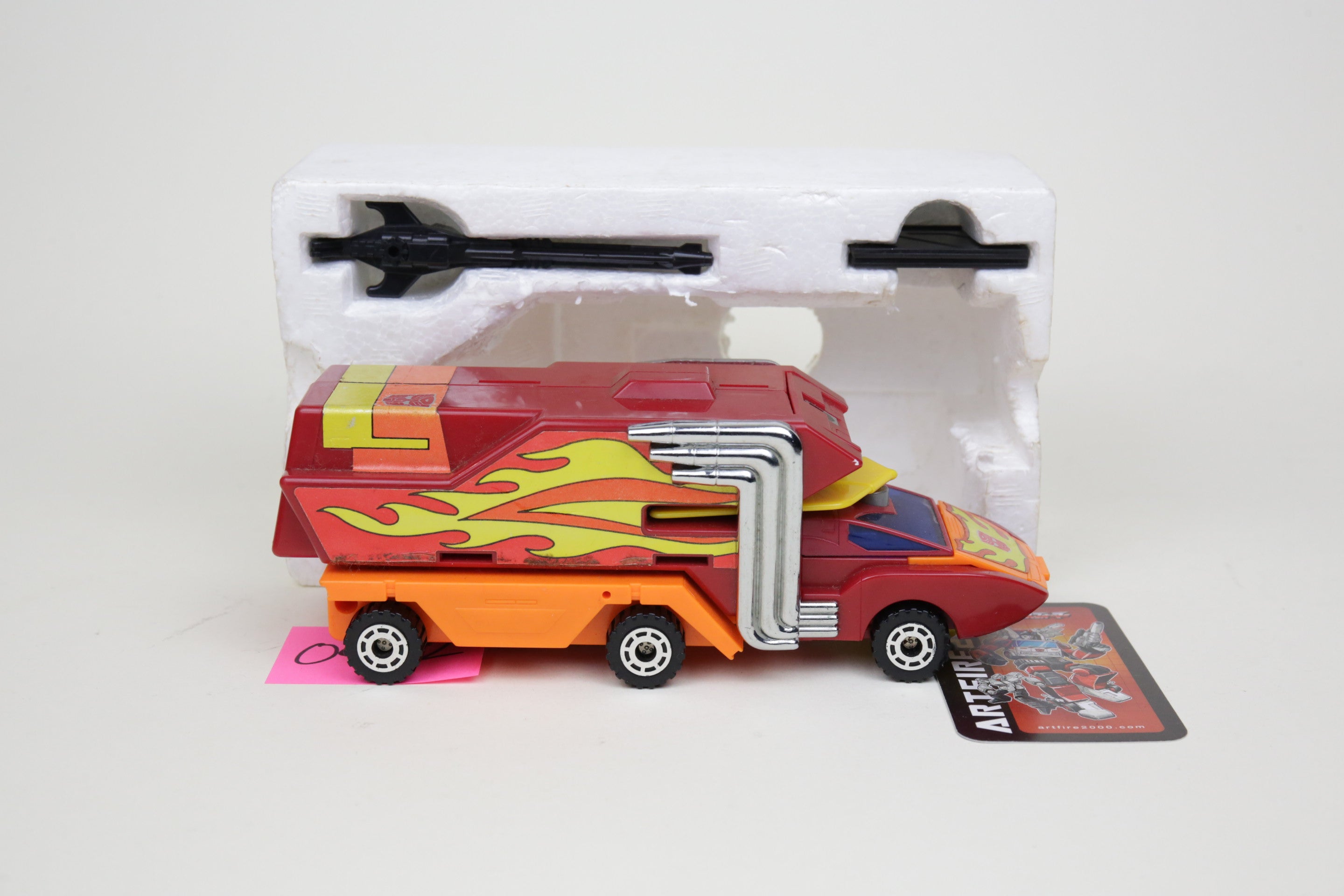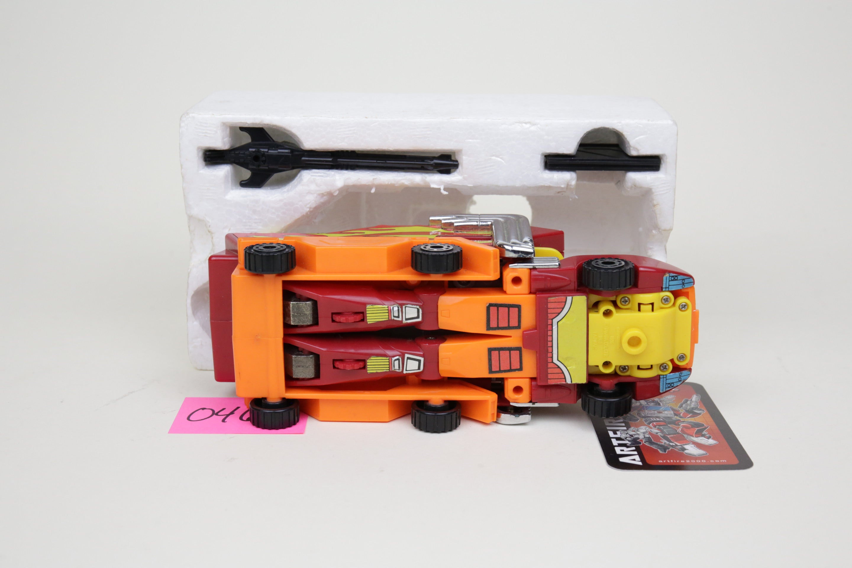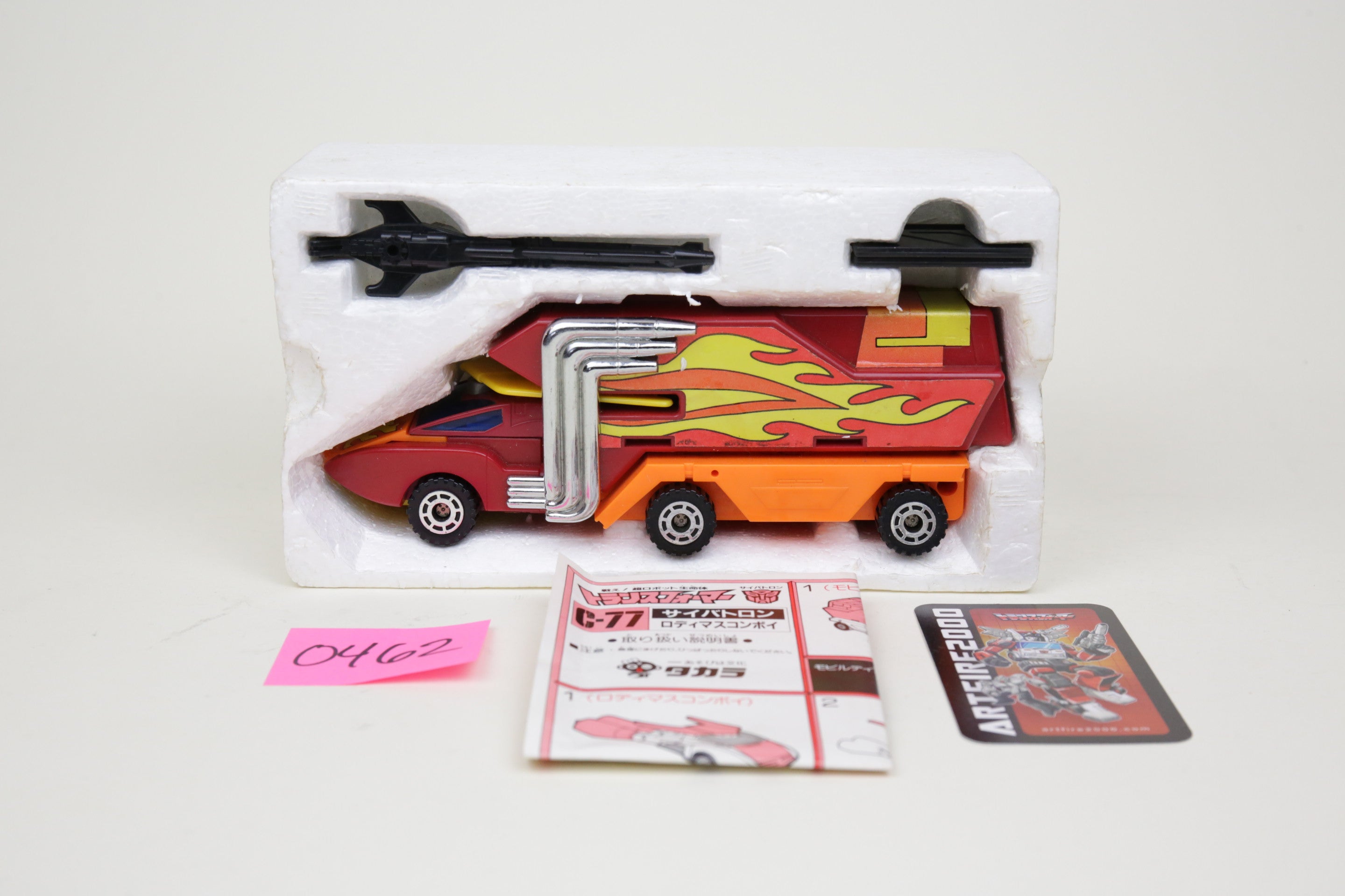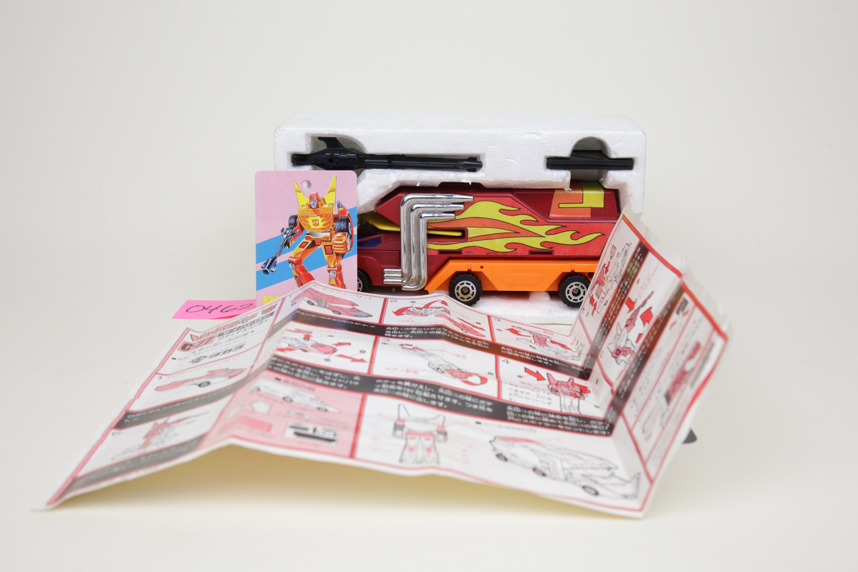 Rodimus comes complete with instructions as shown, in nice condition. Box has wear but displays well. This is the Japanese variant with metal toes and plastic wheels.